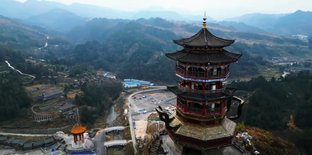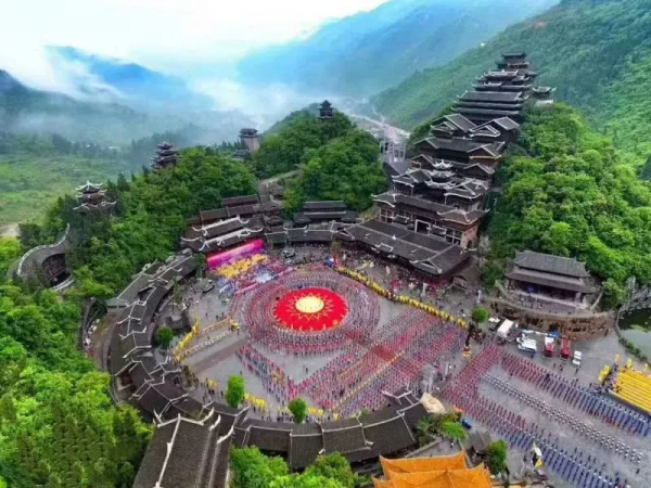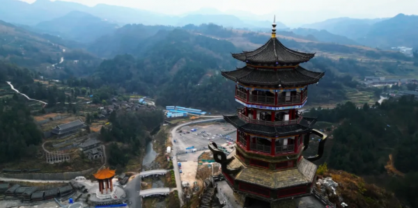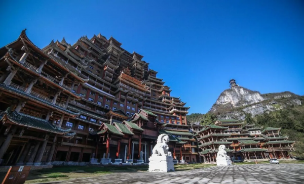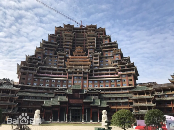 李宏進(jìn)設(shè)計(jì)的九黎宮高99米,建筑面積約3萬平方米,是規(guī)模最大的集四合院、吊腳樓、沖天樓為一體的苗族單體建筑,創(chuàng)下三項(xiàng)吉尼斯世界紀(jì)錄(圖源:百度百科)