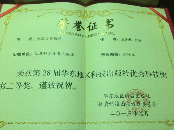 《中國古典園林》榮獲第28屆華東地區(qū)科技出版社優(yōu)秀科技圖書二等獎(jiǎng)