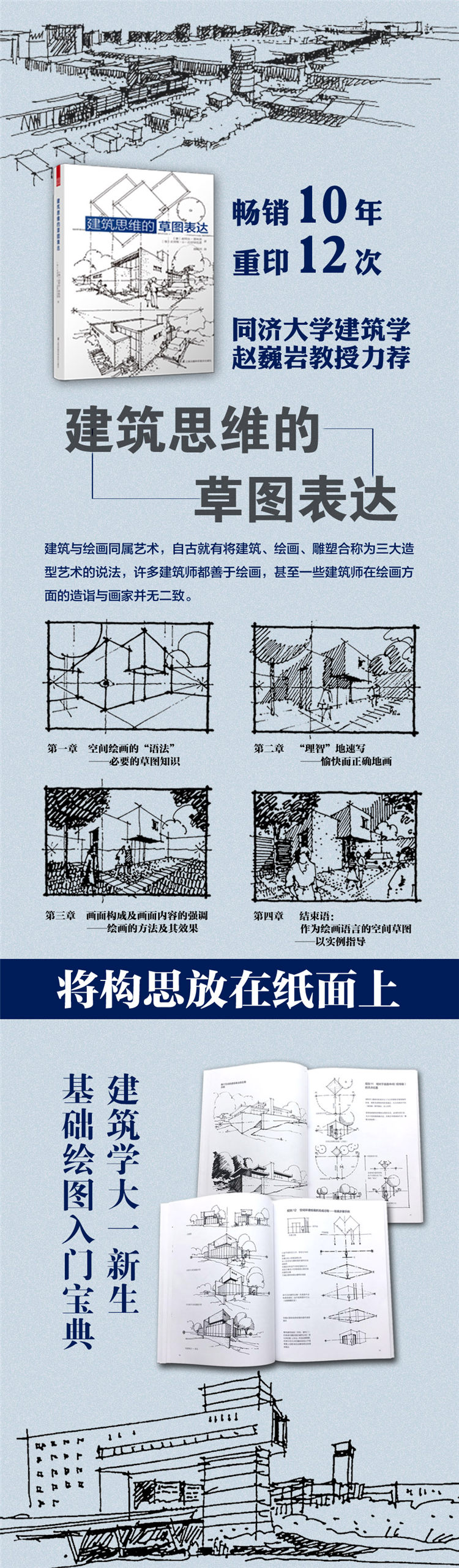 但建筑師有一種獨(dú)特繪畫方式,不是對(duì)已有建筑的表達(dá),而是對(duì)從無到有、無中生有的建筑的表達(dá),在建筑師的創(chuàng)造性活動(dòng)中,不斷地需要將頭腦中的構(gòu)想圖形化,形體、空間,甚至場地氛圍都需要通過這樣的圖畫來進(jìn)行表達(dá),因?yàn)檫@是一種呈現(xiàn)設(shè)計(jì)意圖的最為便捷的方式,這是獨(dú)屬于建筑師的一種繪畫方式。本書就介紹了這樣一種繪圖的方式,在作者循序漸進(jìn)的教導(dǎo)中,初學(xué)者會(huì)發(fā)現(xiàn),掌握這樣一種繪畫方式,既非毫無規(guī)律可循,又是一件饒有興趣的事情,即使是在電腦技術(shù)飛速發(fā)展的今天,這種繪畫方式仍舊是建筑思維表達(dá)的最為有力的方法之一。