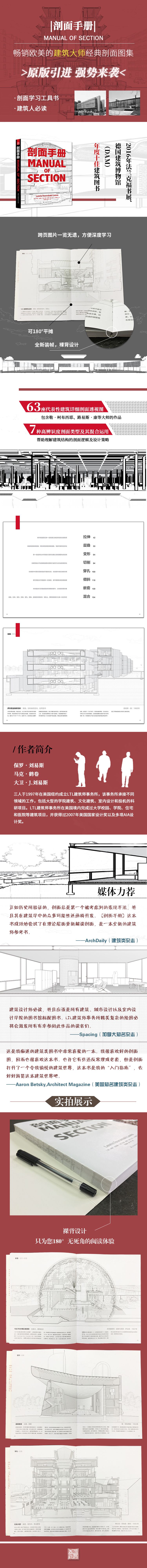 建筑師在建筑設(shè)計(jì)的過程中或是想細(xì)致地了解一座建筑,剖面圖就提供了這一途徑,沒有更好。剖面的綜合性特點(diǎn)使其具有舉足輕重的地位,本書中介紹的一系列對(duì)建筑剖面的系統(tǒng)分類方法,來幫助讀者理解建筑的復(fù)雜性,也更體現(xiàn)了這種舉足輕重的地位。