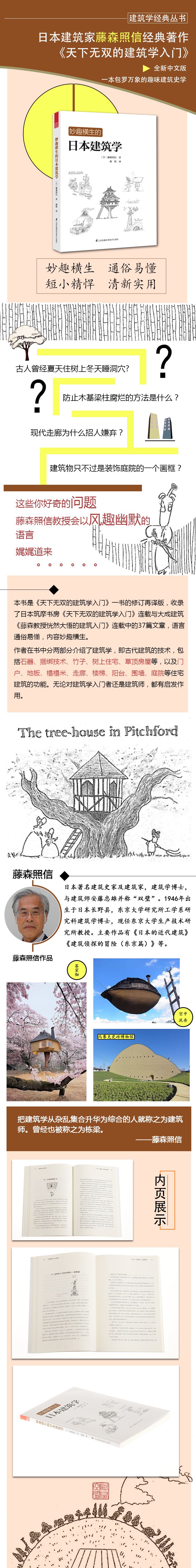 這本書是一本妙趣橫生的建筑學(xué)入門書。書中收錄了筑摩書房《天下無雙的建筑學(xué)入門》連載與大成建筑《藤森教授恍然大悟的建筑入門》連載中的37篇文章。作者在書中分為兩部分介紹了建筑學(xué),即古代建筑的技術(shù)和住宅建筑的功能。藤森照信在書中以風(fēng)趣且通俗易懂的語言詳細(xì)地地講述了日本古代建筑技術(shù),包括對石器、捆綁技術(shù)、竹子、樹上住宅、地基、柱子、草頂房屋等古代技術(shù);第二部分則詳細(xì)的講解了包括住宅、建材、門戶、地板、榻榻米、走廊、天花板、照明、窗戶、廚房、樓梯、陽臺、圍墻、庭院等現(xiàn)代住宅建筑的功能。