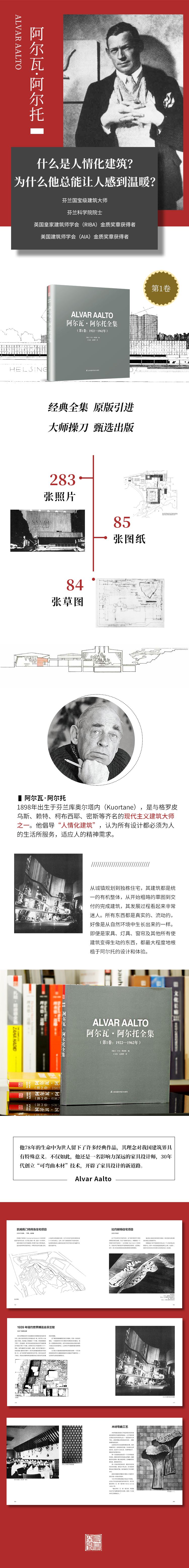 本卷外文原版出版于1963年,是這位大師作品集的第1卷,收錄從1922—1962年的建筑設(shè)計(jì)與規(guī)劃案例,從1929年建成位于圖爾庫的芬蘭劇院,到1962年的新赫爾辛基城市中心方案,通過280余張照片,近200張?jiān)O(shè)計(jì)圖紙和草圖,按時(shí)間順序?yàn)樽x者展示。本書并沒有將阿爾托的建筑設(shè)計(jì)歸類于某種風(fēng)格或流派,也沒有對他的作品小題大做,只是將他的建筑設(shè)計(jì)忠實(shí)、客觀、簡要地展示與陳述給讀者。