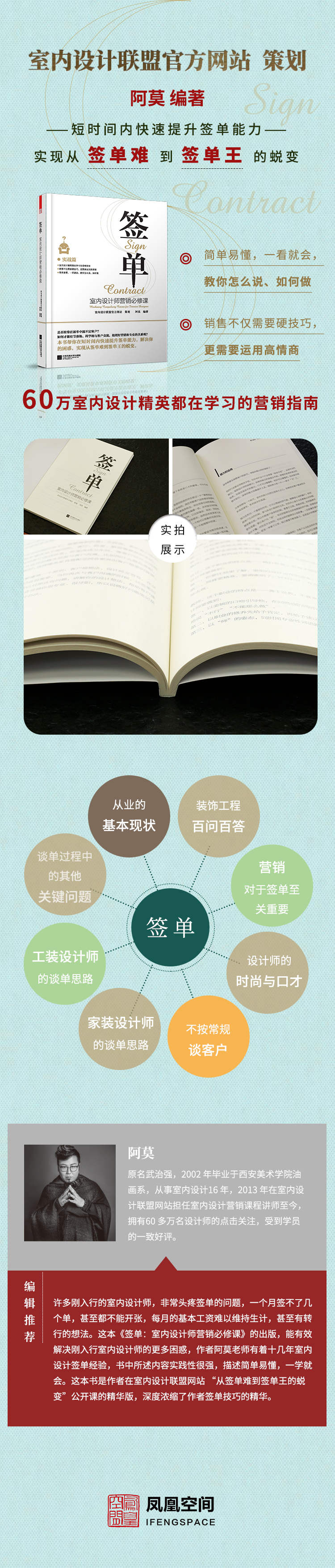 許多剛?cè)胄械氖覂?nèi)設(shè)計師,非常頭疼簽單的問題,一個月簽不了幾個單,甚至都不能開張,每月的基本工資難以維持生計,甚至有轉(zhuǎn)行的想法。這本《簽單:室內(nèi)設(shè)計師營銷必修課》的出版,能有效解決剛?cè)胄惺覂?nèi)設(shè)計師的更多困惑,作者阿莫老師有著十幾年室內(nèi)設(shè)計簽單經(jīng)驗(yàn),書中所述內(nèi)容實(shí)踐性很強(qiáng),描述簡單易懂,一學(xué)就會。這本書是作者在室內(nèi)設(shè)計聯(lián)盟網(wǎng)站 “從簽單難到簽單王的蛻變”公開課的精華版,深度濃縮了作者簽單技巧的精華。