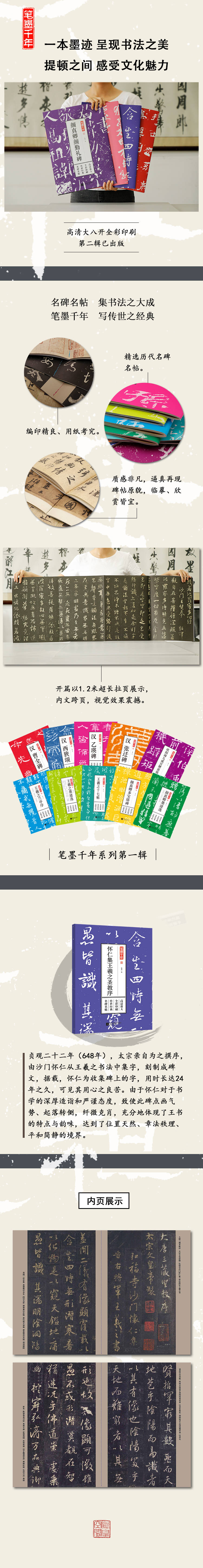 2、本系列精選歷代名碑名帖40余種,大八開全彩印刷、高清放大、編印精良,逼真再現(xiàn)碑帖原貌。