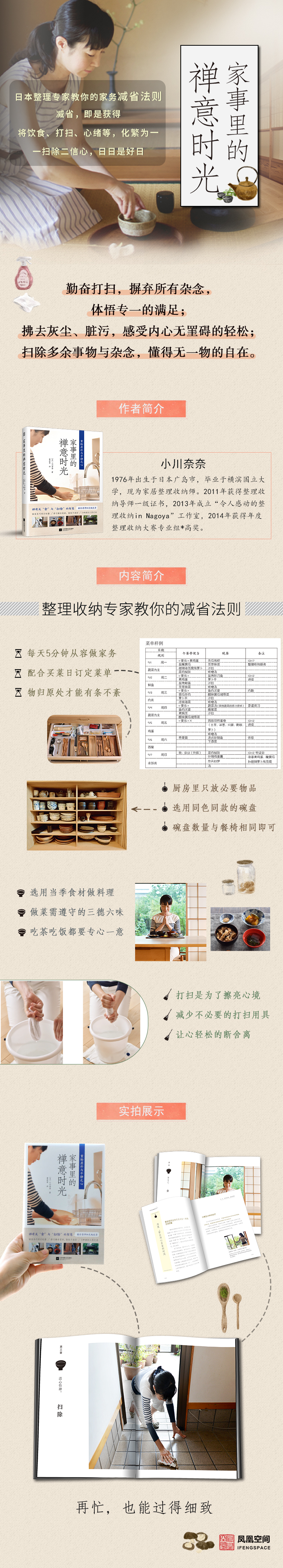 作者將禪有關(guān)“食”和“掃除”的智慧在融入家事技巧之中,對(duì)廚房工作、日常料理、掃除等家務(wù)的方方面面進(jìn)行細(xì)心的指導(dǎo),使每天平凡的家務(wù)事恬靜而美好。本書共四章。第一章主要講述廚房家務(wù)技巧,比如不容易遺忘物品的冰箱收納方法、家庭菜單制定規(guī)則、廚具購買原則、廚余垃圾處置技巧等。第二章主要探討食材烹飪方法和對(duì)待食材的態(tài)度,向讀者傳達(dá)感恩食材、用心烹飪、物盡其用的思想。第三章從簡(jiǎn)化清掃用具、減少物品、制定清掃計(jì)劃等方面講述浴室、廁所、玄關(guān)等處的打掃技巧,著重強(qiáng)調(diào)打掃房間與清潔內(nèi)心的關(guān)聯(lián)。第四章,與讀者分享“照顧腳下”“一掃除二信心”“時(shí)時(shí)勤拂拭”“日日是好日”等有關(guān)生活的禪語。