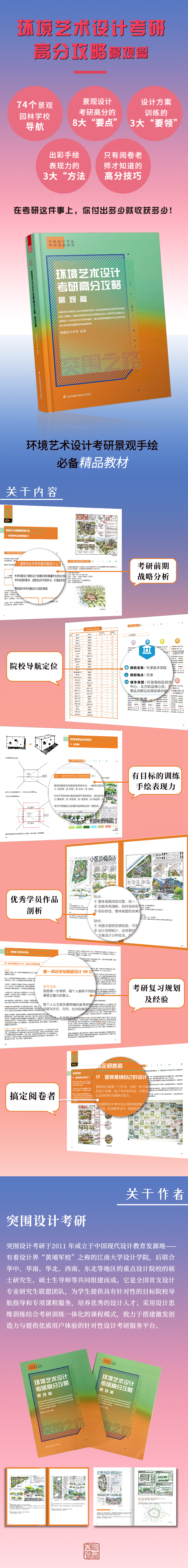 本書是針對環(huán)境藝術(shù)設(shè)計(jì)(景觀園林設(shè)計(jì))方向設(shè)計(jì)考研的專業(yè)課指導(dǎo)用書,從2014 年底立項(xiàng)編纂到2019 年初最終完成,歷經(jīng)十幾位優(yōu)秀導(dǎo)師對于稿件的反復(fù)修改與論證。如何在環(huán)藝(景觀)市場上各類機(jī)構(gòu)出版的五花八門的景觀園林設(shè)計(jì)考研指導(dǎo)用書中脫穎而出,解決所有考生面對設(shè)計(jì)考研的痛點(diǎn)問題,成了編著本書的核心出發(fā)點(diǎn)。不只局限于一套完整的快題設(shè)計(jì)方案,從景觀考研信息分類到最終完成考研設(shè)計(jì)稿的全流程,都是本書要重點(diǎn)分析的知識板塊。