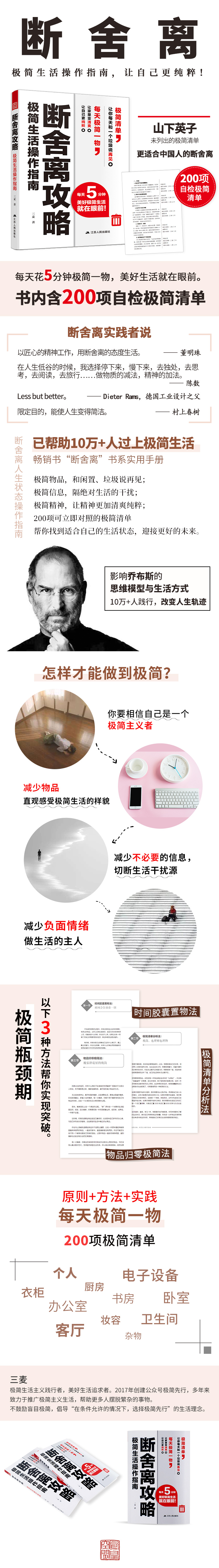本書是一本極富可操作性的實用極簡生活手冊,條理清晰,將生活中的方方面面梳理為物品、信息、精神、個人等多個方面。全書共分為七章,即物品極簡、信息極簡、精神極簡、個人極簡、極簡方法分享、極簡的思考與極簡清單。作者從上述七個方面入手,直觀地介紹如何在生活中進行極簡,如何與陳舊的事物說再見,全方位介紹怎樣通過極簡主義改善生活,文風幽默有趣,有較強的實用性,特別是最后一章的極簡清單,共列出共計200個小項,可以幫助你每天極簡一物,讓家里變清爽,讓自己更純粹。