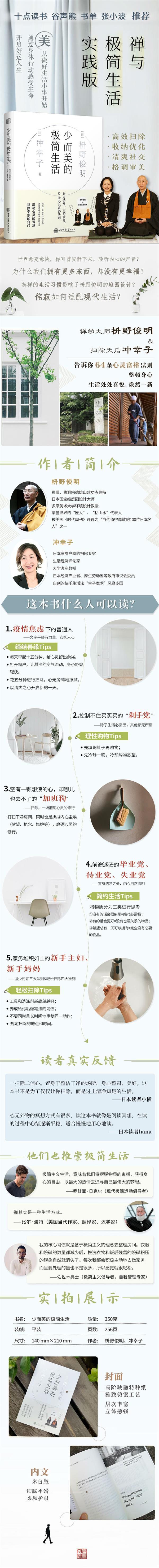 本書作者為日本禪學(xué)大師枡野俊明和掃除專家沖幸子,將禪學(xué)中掃除的智慧和歐洲極簡整理術(shù)相結(jié)合,內(nèi)容共分為三章:第一章,枡野俊明分享掃除與調(diào)和心靈的作用,即通過打掃外部環(huán)境來整理內(nèi)心,去除不必要的執(zhí)著和雜亂的心緒;第二章,沖幸子分享許多實用整理術(shù)及歐洲經(jīng)驗,她指出掃除困難的原因是物品太多,進而講述舍棄物品的準(zhǔn)則;第三章,枡野俊明與沖幸子對談,融合東西雙方關(guān)于掃除的觀點與訣竅,意在使讀者珍惜現(xiàn)有的一切,回歸豐饒的初心,獲得清爽簡單的生活。