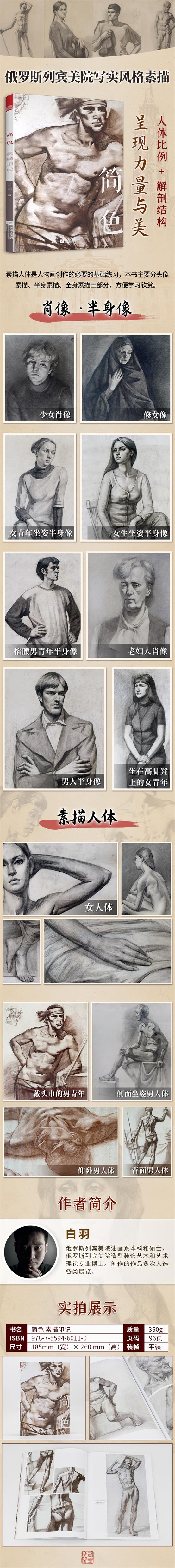 有人說(shuō)素描是單色畫(huà),也有人說(shuō)素描是樸素的描繪.但是菲利普?羅森說(shuō):“素描是簡(jiǎn)色痕跡的藝術(shù)。”可是,簡(jiǎn)色素描并非單色素描,這個(gè)觀點(diǎn)可以在眾多繪畫(huà)大師的素描作品當(dāng)中得到驗(yàn)證,因此我們要擺脫對(duì)素描是單色的誤讀。在列賓美院基礎(chǔ)部素描教學(xué)體系中,多以短期素描為主要教學(xué)手段。短期素描雖然會(huì)缺失一些畫(huà)面中精益求精的細(xì)節(jié),但是可以訓(xùn)練學(xué)生快速發(fā)現(xiàn)畫(huà)面問(wèn)題的觀察和糾錯(cuò)能力,更有助于學(xué)生敏銳地捕捉人物結(jié)構(gòu)特點(diǎn)、動(dòng)作肢體透視特點(diǎn)和空間虛實(shí)特點(diǎn),為長(zhǎng)期素描訓(xùn)練打下堅(jiān)實(shí)基礎(chǔ)?!逗?jiǎn)色——素描印記》一書(shū)是一本彩色印刷的,素描作品欣賞書(shū)籍。本作品集大概38-40幅素描繪畫(huà)作品。所涵蓋作品主要風(fēng)格是傳統(tǒng)繪畫(huà)寫(xiě)實(shí)風(fēng)格,強(qiáng)調(diào)的是人體解剖結(jié)構(gòu),人體比例和人體力量美學(xué),展現(xiàn)扎實(shí)的人物題材繪畫(huà)寫(xiě)實(shí)能力。