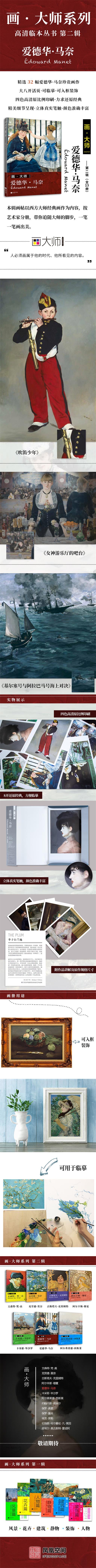 本系列畫帖以西方大師經(jīng)典畫作為內(nèi)容,主要以臨摹、賞飾為主,按藝術(shù)家分冊。每冊32張精選大師代表作。深入考慮國內(nèi)讀者需求和審美習慣,規(guī)避不良題材和消極內(nèi)容,每冊作品精挑細選。每張作品輔以作者及作品扼要講解、說明,并附原作規(guī)格尺寸,使讀者能夠更加深入地了解作者及原作,幫助讀者更準確地理解作品,從而做到在理解的前提下欣賞,和更有目的地臨摹學習。本冊為愛德華?馬奈的作品,一本包括馬奈32幅珍貴畫作,《吹笛少年》《奧林匹亞》《伊爾瑪?布倫娜肖像》《圣雷札火車站》《草地上的野餐》……活頁散裝、方便臨習,高清印刷、原作比例,是教學展示、學生臨摹的不二之選。