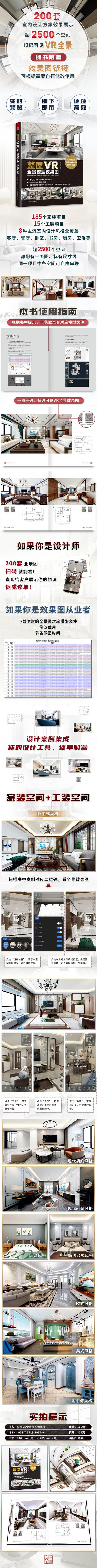 本書中展示的是用酷家樂軟件制作的 200套室內(nèi)設(shè)計效果圖,其中有家裝 185 套、工裝 15 套,涵蓋了目前室內(nèi)設(shè)計中應(yīng)用最多的新中式、現(xiàn)代簡約、現(xiàn)代輕奢、北歐、簡約歐式、歐式、美式、地中海 8 種風(fēng)格。每套效果圖里面各自都包含多個空間,有客廳、餐廳、臥室、書房、廚房、衛(wèi)浴等,全部以 VR 全景的模式展現(xiàn),各空間之間可以自由串聯(lián)。