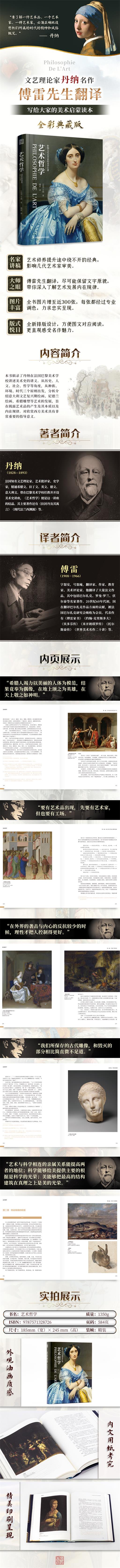 《藝術(shù)哲學(xué)》一書是由丹納在巴黎美術(shù)學(xué)校的美術(shù)史講座匯集而成。他認(rèn)為,藝術(shù)品的產(chǎn)生及藝術(shù)家的創(chuàng)作雖然看似偶然,但有其內(nèi)在規(guī)律,本書即從歷史、人文、社會(huì)、哲學(xué)等角度,從種族、環(huán)境、時(shí)代三個(gè)原則出發(fā),分析介紹了意大利文藝復(fù)興期的繪畫、尼德蘭的繪畫、希臘的雕塑等藝術(shù)的發(fā)展,旨在揭露藝術(shù)品的產(chǎn)生及其本質(zhì)以及內(nèi)在規(guī)律。