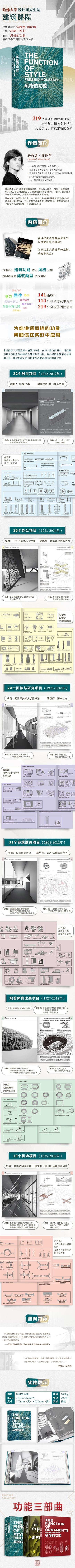 作為穆薩維的“功能”系列的第三卷,《風(fēng)格的功能》提供了一種全新的思辨風(fēng)格的方法,同時將建筑類型學(xué)歸納得相當(dāng)完善,并形成了一套以案例為主的框架。 本書整合羅列了20世紀(jì)90年代至今的典型項目,其中也包含20世紀(jì)早期的一些建筑,它們因空間和功能的相似性被列到一起。通過研究它們的相似性并強調(diào)差異,因為差異意味著傳承發(fā)展,它有助于建筑師探索風(fēng)格的作用。