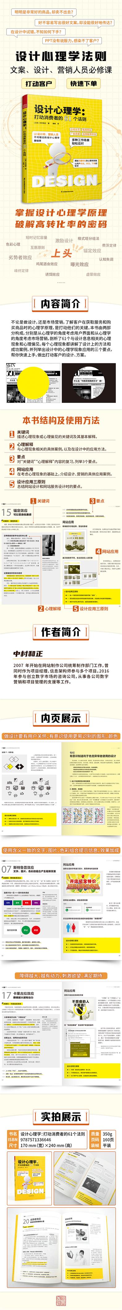 全書(shū)由兩章構(gòu)成,分別是從心理學(xué)的角度考慮用戶(hù)界面和從心理學(xué)的角度考慮市場(chǎng)營(yíng)銷(xiāo)。全書(shū)共61個(gè)設(shè)計(jì)法則,每個(gè)法則包括關(guān)鍵詞(作為心理現(xiàn)象和心理偏見(jiàn)熟知的關(guān)鍵詞,及其基本解說(shuō))、心理解說(shuō)(對(duì)心理現(xiàn)象的具體案例及在網(wǎng)站上的應(yīng)用進(jìn)行解說(shuō))、概要(作為“關(guān)鍵詞”“心理解說(shuō)”的內(nèi)容復(fù)習(xí),列舉了3個(gè)要點(diǎn))、面向網(wǎng)站設(shè)計(jì)的應(yīng)用(在考慮了心理現(xiàn)象的網(wǎng)站上,介紹設(shè)計(jì)、網(wǎng)站營(yíng)銷(xiāo)的應(yīng)用案例)、設(shè)計(jì)上活用的三條原則(作為“網(wǎng)站應(yīng)用”的總結(jié),記述在進(jìn)行網(wǎng)站、網(wǎng)站服務(wù)設(shè)計(jì)時(shí)的要點(diǎn))。