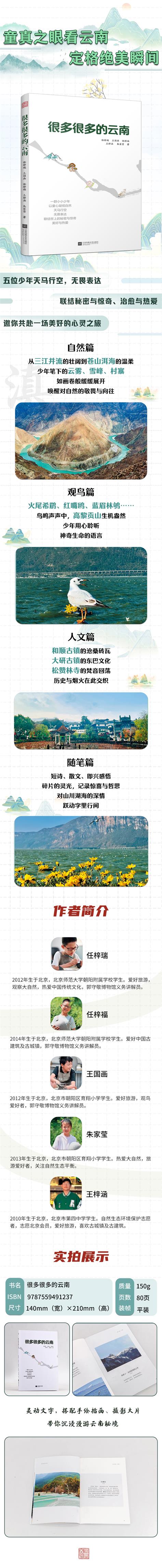 《很多很多的云南》是一本充滿愛心、童心和旅游樂趣的作品。五位少年將他們在云南研學的所思所想所感形成文字,表達出對生活和自然地熱愛。全書分為自然風光、觀鳥、人文、隨筆四大部分。自然風光主要包括對云南自然環(huán)境的描述,觀鳥主要是對云南各種各樣鳥類的描寫和敘述,人文主要是云南古城、古鎮(zhèn)的旅游筆記,隨筆是小作者們對云南行程的感受隨筆。全書文字清新自然,童趣盎然,充滿了對大自然探索的樂趣和好奇心,讓讀者為之感慨贊嘆。
