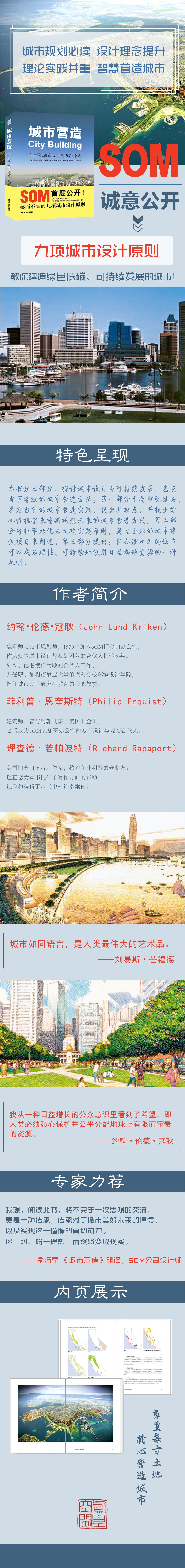 成功的城市來(lái)自于人們倡導(dǎo)更容易的去理解人的價(jià)值和原則,這些原則兼顧到感官,觸覺(jué)和環(huán)境可持續(xù)的特性,以及人們?nèi)σ愿叭プ龀龅脑O(shè)計(jì)。同時(shí),這些原則應(yīng)該可以普遍適用,并被人們所認(rèn)可。作者希望在書(shū)中闡述的這些SOM一直在使用的原則,可以使關(guān)心城市生活的人們?nèi)プ鲆恍┧麄冊(cè)谠诤芫靡郧熬蛻?yīng)該做的事情:更負(fù)責(zé)任并尊重地使用土地,在智能和適當(dāng)?shù)幕A(chǔ)設(shè)施背景內(nèi)建造城市。???